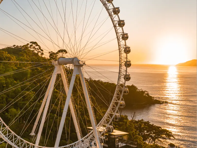 Com 65 metros de diâmetro e 82 metros em seu ponto mais alto, conta com 36 cabines climatizadas para até 6 pessoas, oferecendo uma vista panorâmica 360º que conecta oceano, cidade e Mata Atlântica em um passeio confortável, seguro e silencioso.