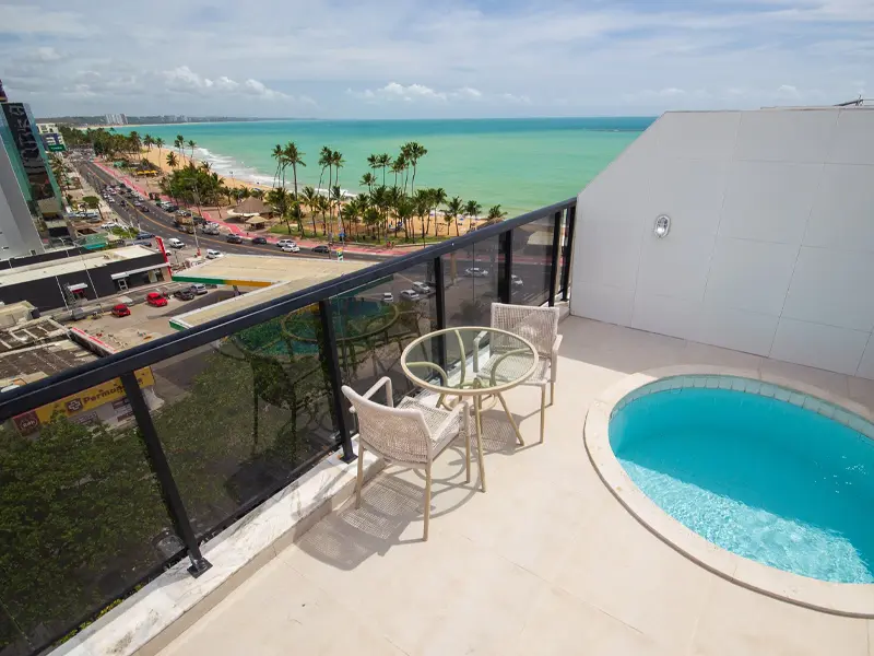Todas as acomodações possuem varanda com vista lateral para o mar, cama King Size ou 02 camas de solteiro “estilo Twin”, frigobar, TV Smart, cofre digital, internet Wi-Fi, ar-condicionado e secador de cabelos. Na Suíte Master temos vista frontal, além da lateral, e contamos também com unidades com banheira de hidromassagem, entre outros serviços.